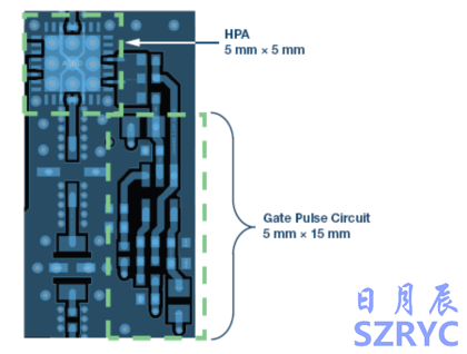 對一個代表性布局做了尺寸研究,如圖6所示。柵極脈沖電路的運(yùn)算放大器部分放置在通向HPA輸入的RF路徑附近。精密DAC未顯示出來,假定其放置在控制部分中,為多個發(fā)射通道提供輸入。布局研究表明,可將該電路添加到實際的低成本PWB實現(xiàn)方案中,發(fā)射RF電路所需的額外空間極小。