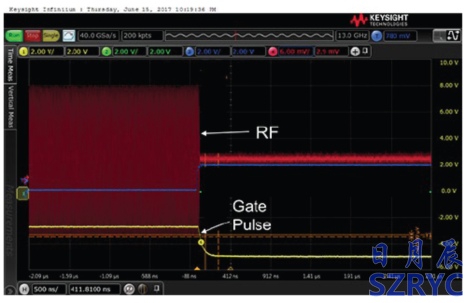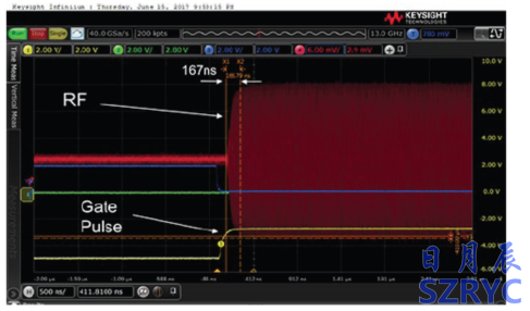 實測開啟時間如圖4所示。時間標(biāo)度為每格500 ns,RF信號的上升時間小于200 ns。對于測量從柵極脈沖開始到RF脈沖上升沿結(jié)束的時間的系統(tǒng),可以看到開啟時間約為300 ns,這說明系統(tǒng)分配1 μs用于發(fā)射到接收轉(zhuǎn)換會有相當(dāng)可觀的裕量。