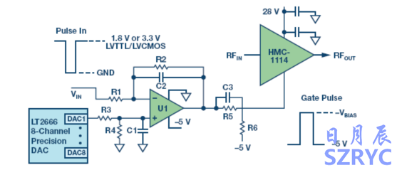 用于驗證電路的測試設(shè)置如圖3所示。對精密DAC、運(yùn)算放大器和HPA使用評估板。一個脈沖發(fā)生器用于模擬1.8 V邏輯信號。信號發(fā)生器連續(xù)工作,利用一個輸入帶寬高于RF頻率的RF采樣示波器測量HPA對RF信號的開啟/關(guān)閉。