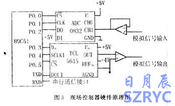每臺現(xiàn)場控制器是各自獨立的系統(tǒng),接收(溫度或壓力)傳感器輸出的模擬信號,和工藝要求的參數(shù)相比較,從而得出該路信號修正量的大小。輸出的模擬信號作為電磁閥的輸入信號來控制流量(氣體或水蒸氣)的大小,從而達到對溫度或壓力的控制。圖3是它的硬件電路。
