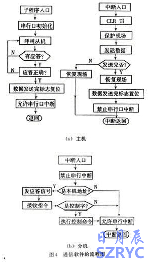 系統(tǒng)通信軟件有主控制器(主機)通信軟件和現(xiàn)場控制器(從機)通信軟件組成。由于現(xiàn)場控制器還要完成信號的監(jiān)測和控制,所以為了提高工作效率,在主從機發(fā)送和接收過程中,都采用中斷控制方式。