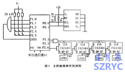 主控制器通過串行通信接口實現(xiàn)對各現(xiàn)場控制器的直接控制,主要用于實現(xiàn)人-機對話功能。由于該系統(tǒng)實時性要求不是很高,為了減少線路板的面積和減少占用單片機的口線,選用體積小、管腳少、可以串行輸入/輸出的芯片。