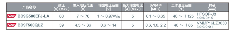 “BD9G500EFJ-LA”適用于48V電源系統(tǒng),具有業(yè)內(nèi)超高的80V耐壓,同時(shí)由于其內(nèi)置MOSFET,可實(shí)現(xiàn)同類產(chǎn)品中高達(dá)5A的輸出電流,且支持大功率,從而有助于5G通信基站和充電樁等設(shè)備實(shí)現(xiàn)更高可靠性和性能。而“BD9F500QUZ”則適用于24V電源系統(tǒng),采用小型薄型封裝(3.0mm×3.0mm×0.4mm),雖然小巧卻實(shí)現(xiàn)了39V的耐壓和5A的輸出電流,有助于以FA設(shè)備為首的眾多先進(jìn)工業(yè)設(shè)備實(shí)現(xiàn)更高性能和更小體積。