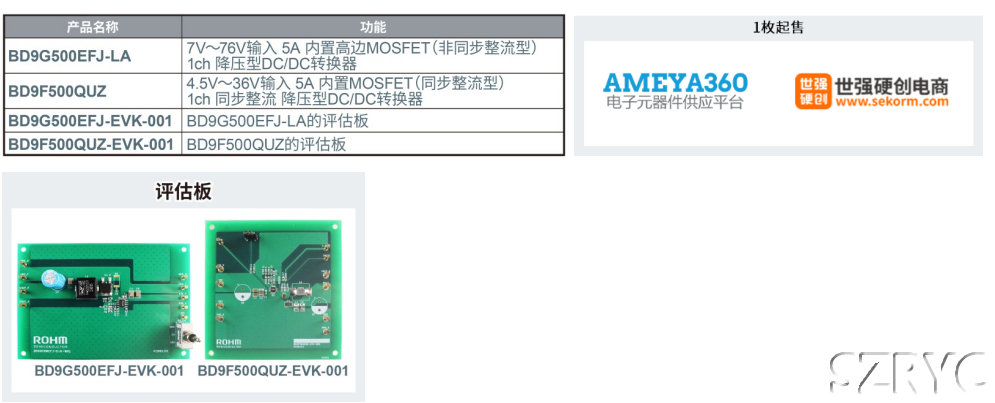 新產(chǎn)品已于2021年5月開始暫以月產(chǎn)10萬個(gè)的規(guī)模投入量產(chǎn)(樣品價(jià)格 500日元/個(gè),不含稅)。新產(chǎn)品和評(píng)估板“BD9G500EFJ-EVK-001”和“BD9F500QUZ-EVK-001”已經(jīng)開始通過電商進(jìn)行銷售,從AMEYA360、SEKORM等電商平臺(tái)均可購(gòu)買。