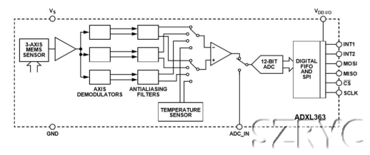 計步方案使用最多的就是三軸加速度傳感器,通過算法識別行走時的三軸動態(tài)數(shù)據(jù),即可實現(xiàn)計步功能。本方案是基于可穿戴設(shè)備,因此芯片的功耗、體積成為重要考慮因素。ADXL363是一款超低功耗的3個傳感器組合產(chǎn)品,由3軸MEMS加速度計、溫度傳感器和用于同步轉(zhuǎn)換外部信號的ADC輸入端組成。整個系統(tǒng)輸出數(shù)據(jù)速率為100 Hz時功耗低于2µA,在運動觸發(fā)喚醒模式下功耗為270 nA;1.6~3.5V工作電源范圍,便捷的兼容其他器件的電源;ADXL363還提供針對內(nèi)部ADC的訪問,可同步轉(zhuǎn)換外部的模擬輸入。緊湊型的LGA封裝非常符合可穿戴式設(shè)備應(yīng)用。其內(nèi)部功能框圖如圖2。