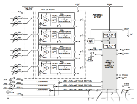基于光電式的心率監(jiān)測方案(也稱光電容積脈搏波描記法PPG),硬件上需要有光源驅(qū)動、光電轉(zhuǎn)換、模數(shù)轉(zhuǎn)換數(shù)據(jù)處理等模塊。一般光源驅(qū)動我們選擇恒流源(需要可以微調(diào)電流和一定的頻率開關(guān));光電轉(zhuǎn)換選擇光電二極管然后用運放進(jìn)行流壓轉(zhuǎn)換和信號調(diào)理;最后用A/D芯片實現(xiàn)模擬量的數(shù)字轉(zhuǎn)換并送至MCU進(jìn)行處理。硬件方案如果采用分立器件,那么芯片數(shù)量較多,并且空間受限,所以最好還是采用集成器件。ADI公司擁有多功能光電式測量前端芯片(型號:ADPD105),完全集成式AFE、ADC、LED 驅(qū)動器和時序內(nèi)核, 提供一流的環(huán)境光抑制性能,無需光電二極管濾光器;靈活的數(shù)字接口SPI、I2C 可供選擇;功耗低,1.8 V模擬/數(shù)字超低工作電源,待機(jī)模式僅0.3μA電流,適合電池供電的設(shè)備;靈活的采樣頻率范圍:0.122 Hz ~3820 Hz;多達(dá)3個LED恒流源,每通道峰值電流達(dá)370mA;擁有WLCSP芯片級封裝,極致的小體積適合空間受限應(yīng)用。其內(nèi)部功能框圖如圖1。