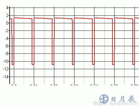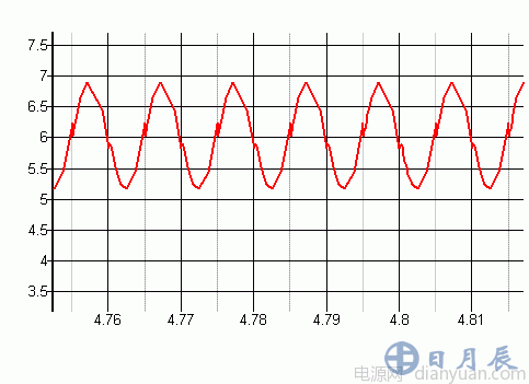 其平均電壓為6V,但是峰峰值,卻有2V,顯然C1不夠大,導(dǎo)致驅(qū)動信號最終不夠平。那么把C1變?yōu)?70n。Q1-G的電壓波形就變成如下: