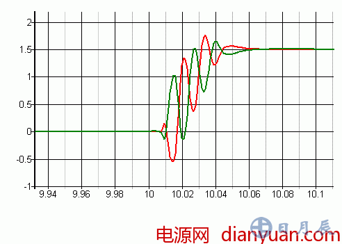對上圖進(jìn)行仿真,R3分別取1歐姆,和100歐姆。下圖是MOS的G極的電壓波形上升沿。