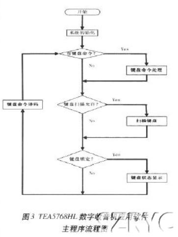關(guān)于鍵盤的掃描及鍵碼識(shí)別程序,這里不再贅述,讀者可以自行完成。所有的功能由鍵盤輸入開啟,所以鍵盤命令處理程序?qū)⑼瓿稍撓到y(tǒng)的所有功能。以下重點(diǎn)介紹TEA5768HL數(shù)字收音機(jī)的鍵盤命令處理程序。
