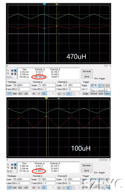 我們對上圖中的boost進(jìn)行仿真,分別對比470uH和100uH時的紋波,示波器中綠色的是輸出電壓,紅色的是電感電流。