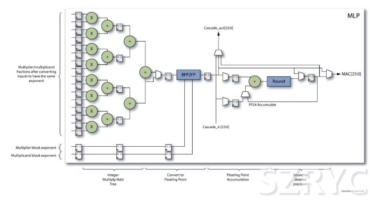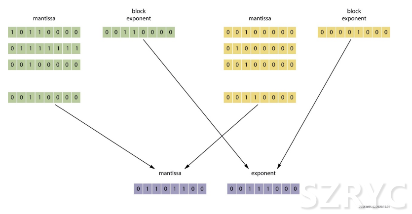 使用塊浮點算法,無需將尾數(shù)左對齊。用于一系列計算的數(shù)據(jù)元素可以共享相同的指數(shù),這一變化簡化了執(zhí)行通道的設(shè)計。對占據(jù)相似動態(tài)范圍的數(shù)值進行四舍五入造成的精度損失可被降到最小。在設(shè)計時就要為每個計算塊選擇合適的范圍。在計算塊完成后,退出函數(shù)就可以對數(shù)值進行四舍五入和標準化處理,以便在需要時將它們用作常規(guī)的浮點值。