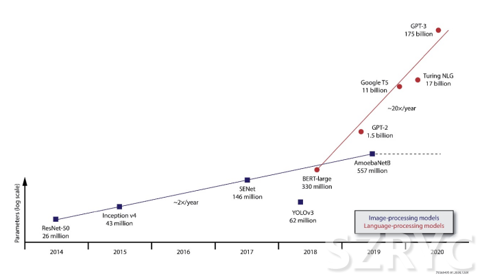 目前在許多前沿領(lǐng)域,模型大小的增長速度遠快于摩爾定律,用于一些應(yīng)用的萬億參數(shù)模型正在考慮之中。雖然很少有生產(chǎn)系統(tǒng)會達到同樣的極端情況,但在這些示例中,參數(shù)數(shù)量對性能的影響將在實際應(yīng)用中產(chǎn)生連鎖反應(yīng)。模型大小的增長給實施者帶來了挑戰(zhàn)。如果不能完全依靠芯片擴展路線圖,就需要其他解決方案來滿足對模型容量增加部分的需求,而且成本要與部署規(guī)模相適應(yīng)。這種增長要求采用定制化的架構(gòu),以最大限度地發(fā)揮每個可用晶體管的性能。