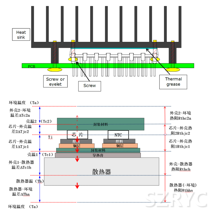 在準(zhǔn)備評(píng)估結(jié)溫前,我們先復(fù)習(xí)一遍IPM的熱阻模型,如下圖以英飛凌自帶NTC的Mini系列IPM模塊散熱器安裝結(jié)構(gòu)為例: