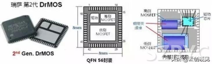 QFN主要用于集成電路封裝,MOSFET不會(huì)采用。不過(guò)因Intel提出整合驅(qū)動(dòng)與MOSFET方案,而推出了采用QFN-56封裝(“56”指芯片背面有56個(gè)連接Pin)的DrMOS。