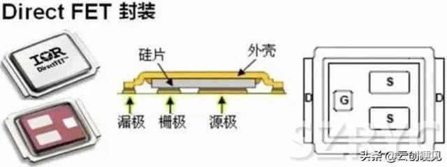 Direct FET封裝屬于反裝型,漏極(D)的散熱板朝上,并覆蓋金屬外殼,通過金屬外殼散熱。Direct FET封裝極大地改善了散熱,并且占用空間更小,散熱良好。