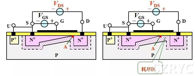 如上圖,在開啟電壓不足時,N區(qū)和襯底P之間因為載流子的自然復(fù)合會形成一個中性的耗盡區(qū)。