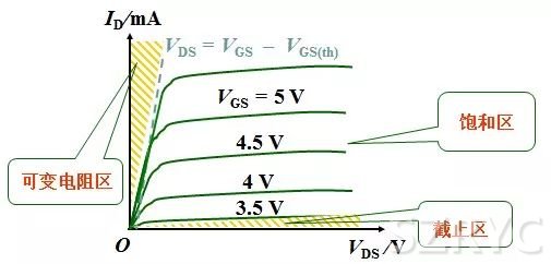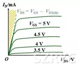 Vgs為常數(shù)時,Vds上升,Id近似線性上升,表現(xiàn)為一種電阻特性。