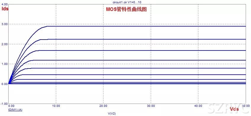 Vds為常數(shù)時,Vgs上升,Id近似線性上升,表現(xiàn)出一種壓控電阻的特性。