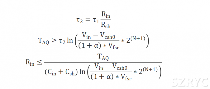 根據(jù)ADC內(nèi)部結(jié)構(gòu)和,我們可以很輕松的推導(dǎo)出,第二階段的時間遠(yuǎn)遠(yuǎn)大于第一階段的時間,同時,我們也可以推導(dǎo)出,采樣時間和輸入電阻必須滿足: