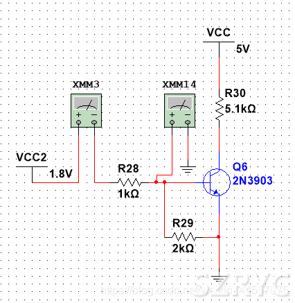 一、R28=1K、R30=5.1K、R29=2K,VCC=5V、VCC2=1.8V,那么萬用表XMM3上的電流和萬用表XMM14上的電壓為多大呢,下面看仿真截圖: