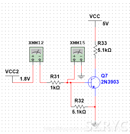 一、R31=1K、R33=5.1K、R32=5.1K,VCC=5V、VCC2=1.8V,那么萬用表XMM12上的電流和萬用表XMM15上的電壓為多大呢,下面看仿真截圖: