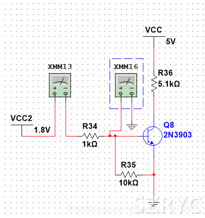 一、R34=1K、R36=5.1K、R35=10K,VCC=5V、VCC2=1.8V,那么萬用表XMM13上的電流和萬用表XMM16上的電壓為多大呢,下面看仿真截圖: