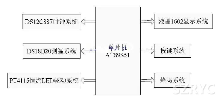 該多功能 LED 臺燈系統(tǒng)采用20 只5mm 高亮白光LED 燈珠為光源,以AT89S51 單片機為主控芯片,由LED 恒流驅(qū)動系統(tǒng)、時鐘系統(tǒng)、測溫系統(tǒng)、液晶顯示系統(tǒng)、蜂鳴系統(tǒng)、按鍵系統(tǒng)組成。系統(tǒng)結(jié)構(gòu)框圖如圖1 所示。