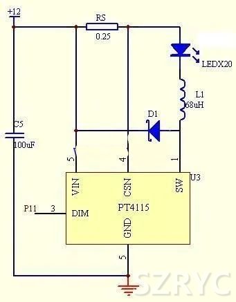 本設(shè)計 L ED 光源采用相互并聯(lián)方式,共由20 只5mm 高亮度小功率LED 燈珠組成;每只LED 燈珠的壓降約3.1V,工作電流約20mA.由白光LED 的正向伏安特性可知,當(dāng)LED 端電壓超過其正向?qū)妷汉螅^小的電壓波動都會導(dǎo)致工作電流的的劇烈變化,從而影響LED 的正常使用,固LED 宜采用恒流驅(qū)動方式。因此,本設(shè)計LED 采用高性能PT4115 恒流芯片驅(qū)動,PT4115 是一款連續(xù)電感電流導(dǎo)通模式的降壓恒流源芯片,能將直流電壓直接轉(zhuǎn)換成穩(wěn)定的恒流輸出;其采用6~30V 寬電壓輸入,輸出電流可達1.2A,轉(zhuǎn)換效率高達97%,輸出電流精度達±5%.該芯片內(nèi)部含有抖頻特性,極大的改善EMI,同時具有過溫、過壓、過流、LED 開路保護等多種功能。該芯片適合用于綠色照明LED燈的驅(qū)動電路,具有應(yīng)用電路非常簡潔的優(yōu)點。LED 恒流驅(qū)動電路如圖3 所示。