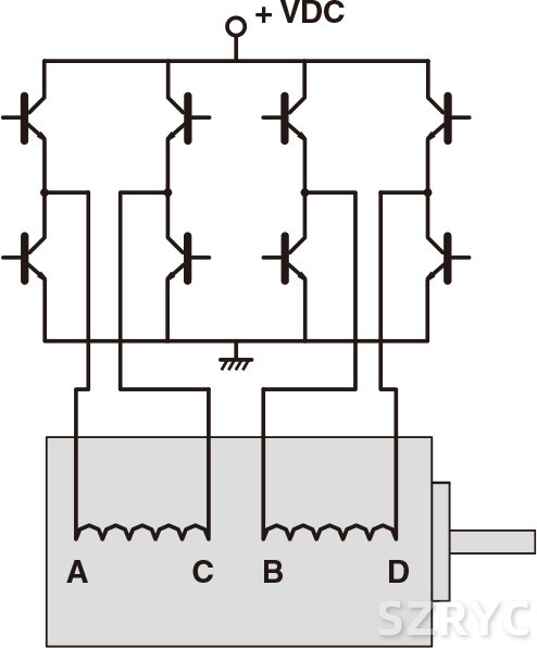 兩相步進(jìn)電機(jī)有兩種繞組形式:雙極性和單極性。雙極性電機(jī)每相上只有一個(gè)繞組線圈,電機(jī)連續(xù)旋轉(zhuǎn)時(shí)電流要在 同一線圈內(nèi)依次變向勵(lì)磁,驅(qū)動(dòng)電路設(shè)計(jì)上需要八個(gè)電子開關(guān)進(jìn) 行順序切換。 |