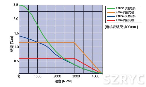 • 相同尺寸下的伺服電機(jī)與步進(jìn)電機(jī)的速度力矩特性比較 |