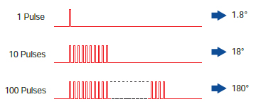 步進(jìn)電機(jī)的轉(zhuǎn)動(dòng)距離正比于施加到驅(qū)動(dòng)器上的脈沖信號(hào)數(shù)(脈沖數(shù))。 步進(jìn)電機(jī)轉(zhuǎn)動(dòng)(電機(jī)出力軸轉(zhuǎn)動(dòng)角度)和脈沖數(shù)的關(guān)系如下所示: |