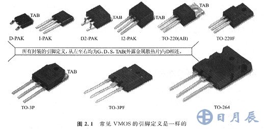 除了小型封裝的VMOS場(chǎng)以外,多數(shù)MOS場(chǎng)效應(yīng)管單管的引腳排列順序是一樣的(圖2.1),極少有例外。讓VMOS的引腳向下,使有字的一面朝向自己,那么從左至右就是G(柵極)、D(漏極)、S(源極),TAB表示散熱片,與漏極相通。小型封裝、多管封裝等則需要查閱器件的技術(shù)手冊(cè),沒有統(tǒng)一規(guī)律可循。