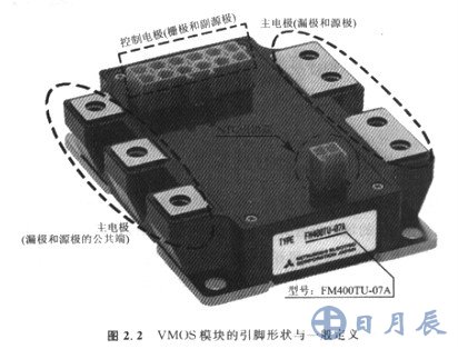VMOS模塊是最為常見的場(chǎng)效應(yīng)管模塊,塑料外殼上一般有引腳定義的標(biāo)識(shí)。引腳標(biāo)識(shí)無外乎兩種方法:一種是直接在引腳附近用寧母標(biāo)識(shí),如G、D、S、SID2(兩管的公共端)等;另一種足引腳用阿拉伯?dāng)?shù)字標(biāo)識(shí),在模塊的側(cè)面有內(nèi)部的等效電路原理圖和引腳編號(hào)。另外,模塊上主電極與副電極從外形上也 是比較容易區(qū)分的,因?yàn)樗鼈兊拇笮 ⑿螤畹牟町惙浅C黠@(圖2.2)。