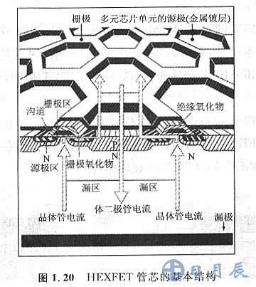 圖1. 20所示的是N溝道的HEXFET的構造表示圖,圖中也畫出了電流的方向。由于MOSFET只能耐受比擬高的正向電壓,多數(shù)MOSFET曾經(jīng)內置了維護二極管,這就是體二極管。關于體二極管,在后續(xù)章節(jié)中還會有細致引見。