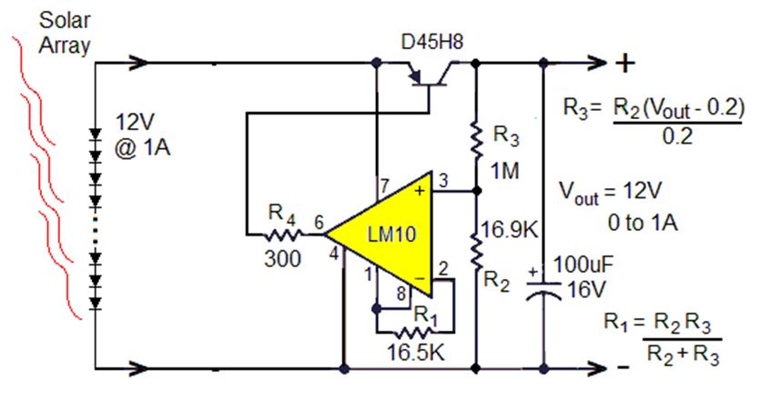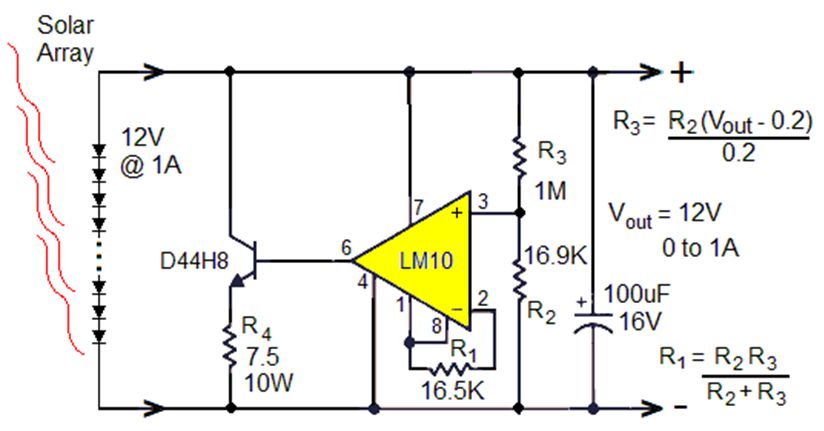 讓我們從一個(gè)假設(shè)的小型太陽能電池陣列開始,該陣列針對(duì) 12W 輸出(在完全陽光直射下 ~1kW/m 2)、1A 和 12V、20% 的光電轉(zhuǎn)換效率進(jìn)行了優(yōu)化,因此標(biāo)稱面積為 ~0.06m 2 = ~ 100 英寸2 . 然后添加線性調(diào)節(jié)電路,以在負(fù)載電流從 0 到 1A 變化時(shí)保持恒定的 12V 輸出。