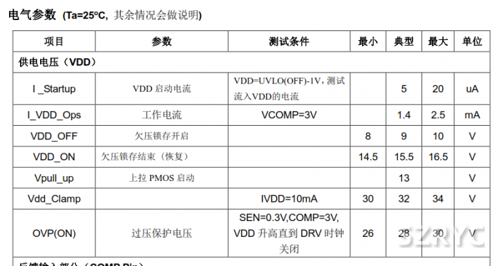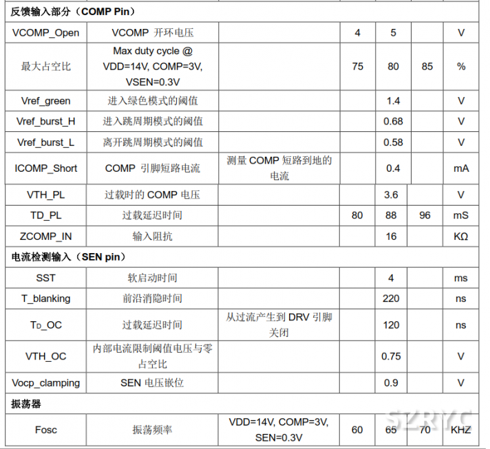 開關(guān)頻率在空載或輕載條件下自行調(diào)節(jié),降低開關(guān)頻率在輕載、空載的情況下可以提高轉(zhuǎn)換效率。只有當(dāng) VDD 電壓下降到低于預(yù)先設(shè)定的值且 COMP 電壓處在適當(dāng)狀態(tài)的時(shí)候,DRV 驅(qū)動(dòng)才處于打開狀態(tài),否則, DRV 驅(qū)動(dòng)將處于關(guān)閉狀態(tài)來最大程度的降低開關(guān)損耗和待機(jī)損耗。