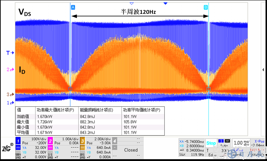 對(duì)于普通 MOS 管來說,不同周期的電壓和電流波形幾乎完全相同,因此整體功率損耗只需要任意測(cè)量一個(gè)周期即可。但對(duì)于 PFC MOS 管來說,不同周期的電壓和電流波形都不相同,因此功率損耗的準(zhǔn)確評(píng)估依賴較長(zhǎng)時(shí)間(一般大于 10ms),較高采樣率(推薦 1G 采樣率)的波形捕獲,此時(shí)需要的存儲(chǔ)深度推薦在 10M 以上,并且要求所有原始數(shù)據(jù)(不能抽樣)都要參與功率損耗計(jì)算,實(shí)測(cè)截圖如圖 3所示。