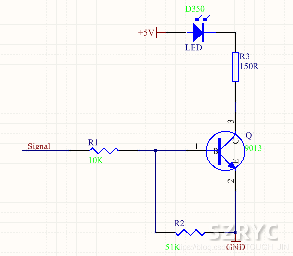 如上面的例子,假設(shè)要使三極管導(dǎo)通,那么基極電壓應(yīng)大于0.7V,假設(shè)Signal = 5V,所以根據(jù)分壓原理有