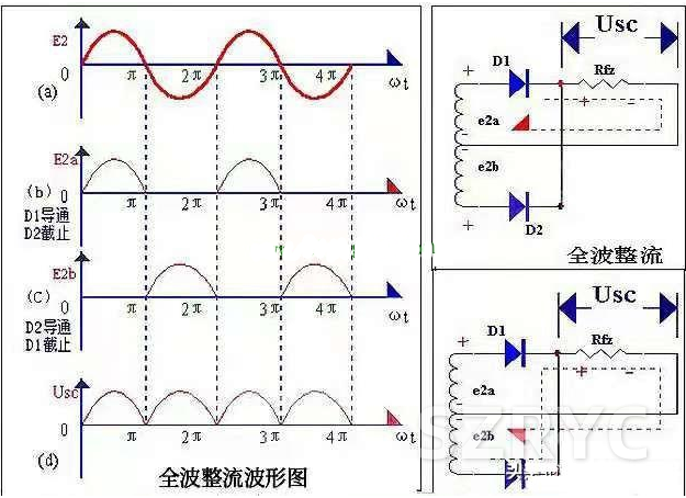 ★如果把整流電路的結(jié)構(gòu)作一些調(diào)整,可以得到一種能充分利用電能的全波整流電路。見上圖所示,它是全波整流電路的電原理圖。全波整流電路,可以看作是由兩個半波整流電路組合成的。變壓器次級線圈中間需要引出一個抽頭,把次組線圈分成兩個對稱的繞組,從而引出大小相等但極性相反的兩個電壓E2a、E2b。構(gòu)成Ea2、D1、Rfz與E2b、D2、Rfz兩個通電回路。全波整流電路的工作原理,可用下圖所示的波形圖說明。在0~π間內(nèi),Ea2對D1為正向電壓,D1導(dǎo)通,在Rfz上得到上正下負(fù)的電壓;E2b對D2為反向電壓,D2不導(dǎo)通,見圖(4b),在π-2π時間內(nèi),E2b對D2為正向電壓,D2導(dǎo)通,在Rfz上得到的仍然是上正下負(fù)的電壓;Ea2對D1為反向電壓,D1不導(dǎo)通,見圖(4c)。