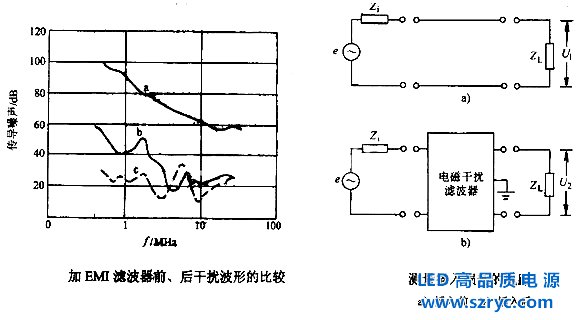 設(shè)置電磁干擾濾波器加入前后傳輸?shù)截?fù)載上的噪聲電壓分別為U1和U2,計(jì)算公式是20lgU1/U2。