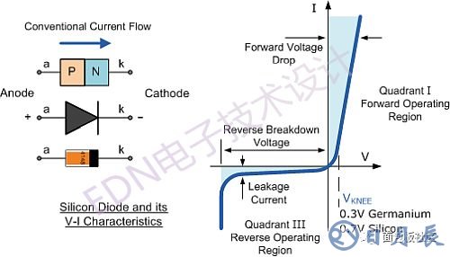 圖1:基本二極管符號、組成、封裝圖和圖形。(圖片來源:《電子和電氣工程師指南》)