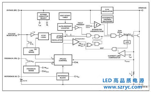 該LYTSwitch-4控制器包括:一個(gè)振蕩器、反饋(檢測及邏輯)電路、5.9V穩(wěn)壓器、遲滯過熱保護(hù)、頻率抖動(dòng)、逐周期電流限制、自動(dòng)重啟、電感校正、功率因數(shù)和恒定的電流控制。圖1為LYTSwitch-4控制器的系統(tǒng)框圖。
