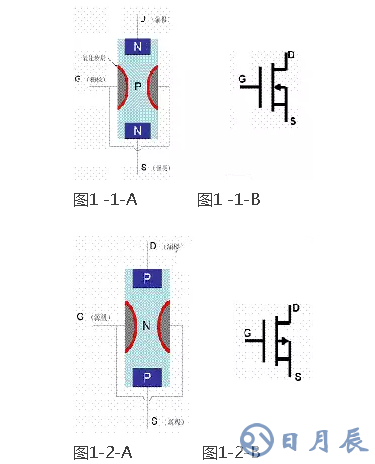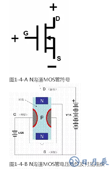 圖1-4-A 是N溝道MOS管的符號(hào),圖中D是漏極,S是源極,G是柵極,中間的箭頭表示襯底,如果箭頭向里表示是N溝道的MOS管,箭頭向外表示是P溝道的MOS管。