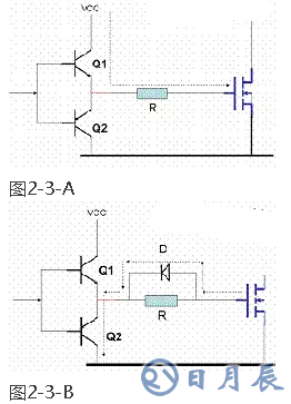 由于MOS管在制造工藝上柵極S的引線(xiàn)的電流容量有一定的限度,所以在Q1在飽和導(dǎo)通時(shí)VCC對(duì)MOS管柵極S的瞬時(shí)充電電流龐大,極易損壞MOS管的輸入端,為了維護(hù)MOS管的安全,在細(xì)致的電路中必需采取措施限制瞬時(shí)充電的電流值,在柵極充電的電路中串接一個(gè)恰當(dāng)?shù)某潆娤蘖麟娮鑂,如圖2-3-A所示。充電限流電阻R的阻值的選取;要根據(jù)MOS管的輸入電容的大小,鼓舞脈沖的頻率及灌流電路的VCC(VCC普通為12V)的大小決議普通在數(shù)十姆歐到一百歐姆之間。