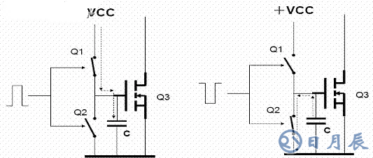 在圖2-2中;在作為開(kāi)關(guān)應(yīng)用的MOS管Q3的柵極S和鼓舞信號(hào)之間增加Q1、Q2兩只開(kāi)關(guān)管,此兩雖然均為普通的晶體三極管,兩雖然接成串聯(lián)銜接,Q1為NPN型Q2為PNP型,基極銜接在一同(理論上是一個(gè)PNP、NPN互補(bǔ)的射極跟隨器),兩雖然等效是兩只在方波鼓舞信號(hào)控制下輪番導(dǎo)通的開(kāi)關(guān),如圖2-2-A、圖2-2-B當(dāng)鼓舞方波信號(hào)的正半周來(lái)到時(shí);晶體三極管Q1(NPN)導(dǎo)通、Q2(PNP)截止,VCC經(jīng)過(guò)Q1導(dǎo)通對(duì)MOS開(kāi)關(guān)管Q3的柵極充電,由于Q1是飽和導(dǎo)通,VCC等效是直接加到MOS管Q3的柵極,瞬間充電電流極大,充電時(shí)間極短,保證了MOS開(kāi)關(guān)管Q3的疾速的“開(kāi)”,如圖2-2-A所示(圖2-2-A和圖2-2-B中的電容C為MOS管柵極S的等效電容)。當(dāng)鼓舞方波信號(hào)的負(fù)半周來(lái)到時(shí);晶體三極管Q1(NPN)截止、Q2(PNP)導(dǎo)通,MOS開(kāi)關(guān)管Q3的柵極所充的電荷,經(jīng)過(guò)Q2疾速放電,由于Q2是飽和導(dǎo)通,放電時(shí)間極短,保證了MOS開(kāi)關(guān)管Q3的疾速的“關(guān)”,如圖2-2-B所示。