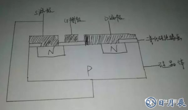 從圖中可以看出柵極G與漏極D及源極S是絕緣的,D與S之間有兩個(gè)PN結(jié)。一般情況下,襯底與源極在內(nèi)部連接在一起,這樣,相當(dāng)于D與S之間有一個(gè)PN結(jié)。