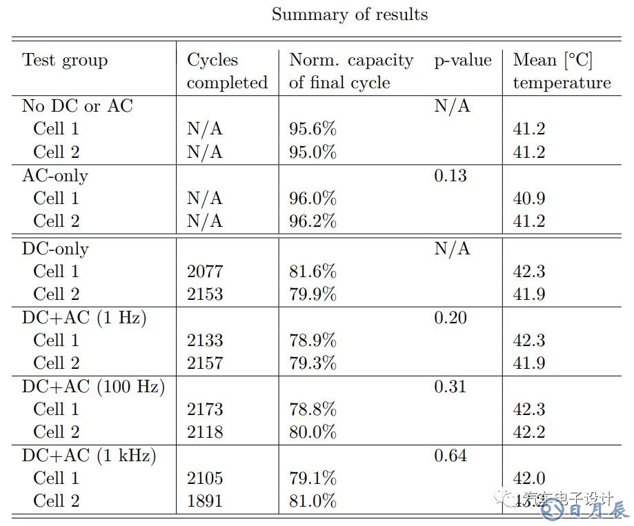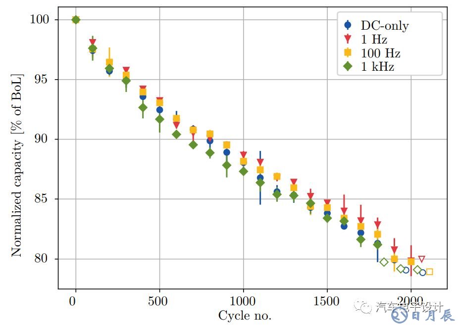 這個(gè)實(shí)驗(yàn)經(jīng)歷了一年的測(cè)試周期,大約2000次循環(huán),大約損失了原始容量的約20%。容量衰減量與是否疊加紋波電流(交流頻率)無(wú)關(guān)