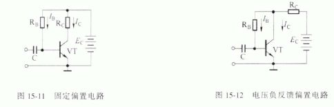 固定偏置電路如圖15-11 所示,它是共發(fā)射極放大電路。當EC和RB一經(jīng)確定,就能得到一個固定的基極電流lB和集電極電流IC, 所以把這種電路叫做固定偏置電路。