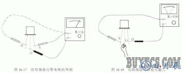 測量用萬用表進(jìn)行,如圖16-18 所示。將萬用表置R x 100 擋,正表筆接源極S ,負(fù)表筆接漏極D. 此時相當(dāng)于給場效應(yīng)管加上了一個1. 5V 的電源電壓.萬用表指示出漏、源極間的電阻值已當(dāng)用手捏住場效應(yīng)管的柵極時.人體的感應(yīng)電壓便加到柵極上,由于管子的放大作用,漏極電流ID會增大.使漏、源極間電阻發(fā)生變化.萬用表的表針會發(fā)生擺動。表針擺動的幅度愈大,則表明管子的放大能力愈強(qiáng);表針擺動幅度愈小,說明管子的放大能力愈