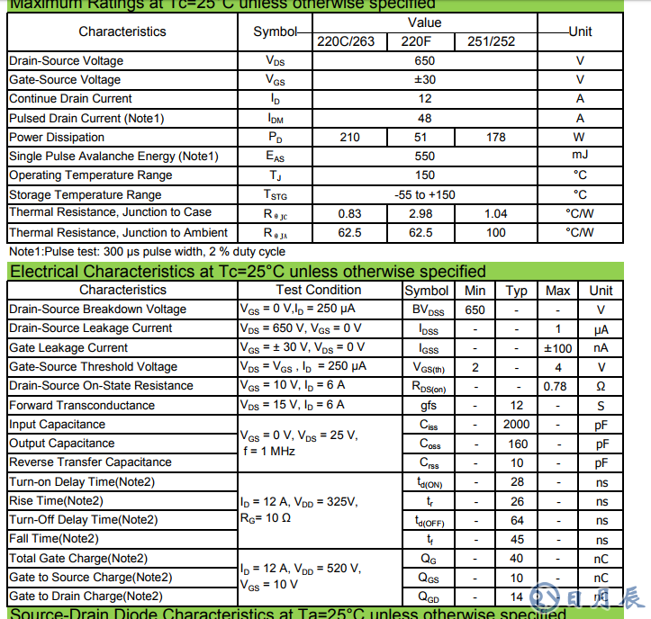 這張圖則基本概括了RYF12N65F這款MOS管的所有詳細(xì)參數(shù)資料。這些都為電源工程師提供選型帶來方便。